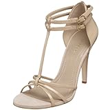 - Strappy vamp connects to a T-strap, dual adjustable ankle straps and full heel cup